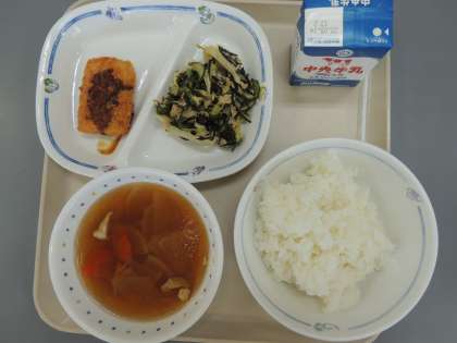 今日の給食は、ご飯、かしわ汁、海藻サラダ、たらフライ、牛乳でした。