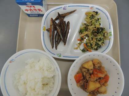 今日の給食は、ご飯、じゃがいものそぼろ煮、アーモンドあえ、きびなごのから揚げ、牛乳でした。