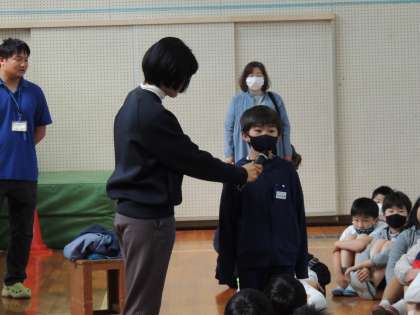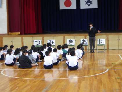 体育館に集まってからは、合言葉「つみきおに」の確認と、自分の身は自分で守ることを学びました。