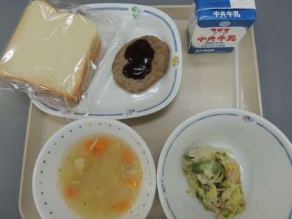 今日の給食は、スライスパン、ハンバーグサンド、アスパラサラダ、大麦と野菜のスープ、牛乳でした。