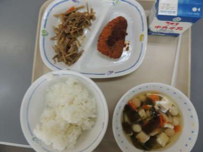 今日の給食は、ご飯、ふだま汁、きんぴらごぼう、かつおフライ、牛乳でした