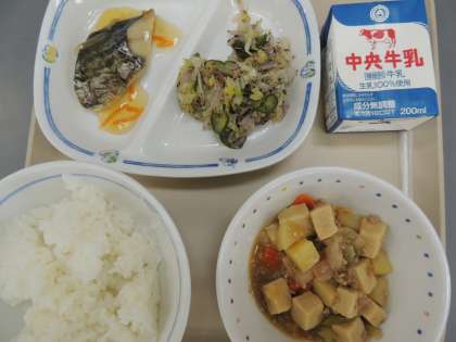 今日の給食は、ご飯、高野豆腐のうま煮、ゆかりあえ、さわらの野菜あんかけ、牛乳でした。