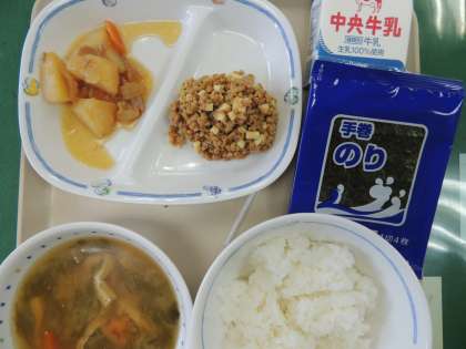 今日の給食は、ご飯、あおさ汁、肉じゃが、納豆巻き、手巻きのり、牛乳でした。