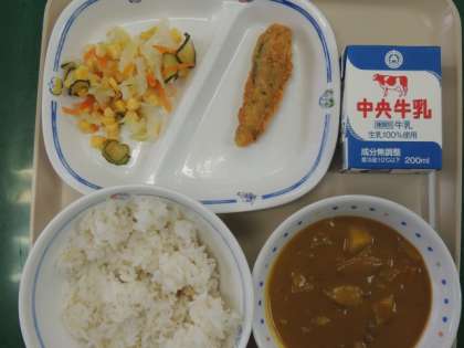 今日の給食は、麦ごはん、カレーライス、サワーキャベツ、あじフリッター、牛乳でした。