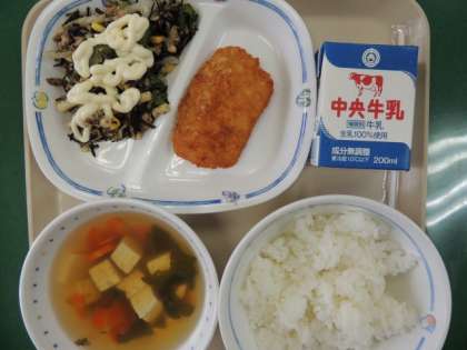 今日の給食は、ご飯、すまし汁、骨太サラダ、いか香味揚げ、牛乳でした。