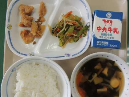 今日の給食は、ご飯、わかめスープ、ナムル、とり肉の香味ソースかけ、牛乳でした。