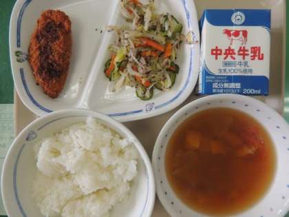 今日の給食は、ご飯、かしわ汁、ゆかりあえ、かつおフライ、牛乳でした。