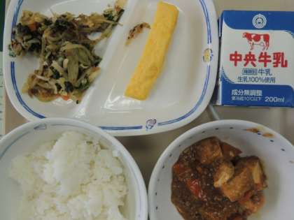 今日の給食は、ご飯、生揚げのみそ炒め、おかかあえ、厚焼き卵、牛乳でした。