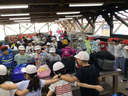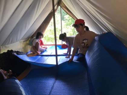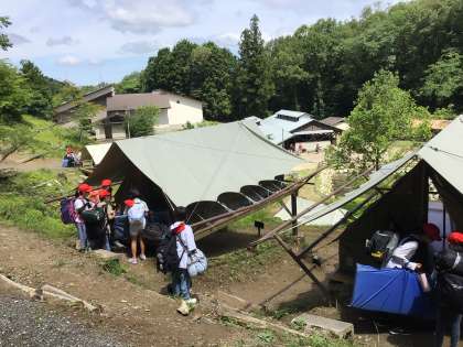 予定より少し早く到着し、入所式をしました。出発式に引き続き、がっちりスクラムを組みました。テントオリエンテーションを聞き、早速テントの中の準備をしています。