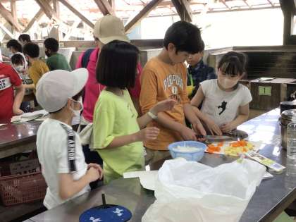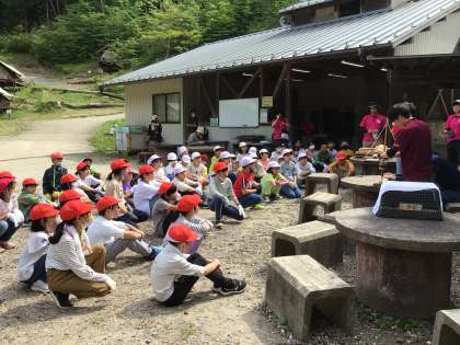カレーの準備を終え、次は火起こし体験です。班のメンバー全員で、「イチ、ニ、イチ、ニ。」と声をかけ合い、協力しています。