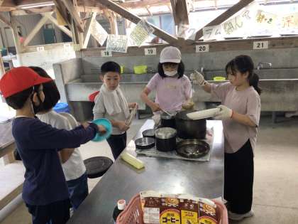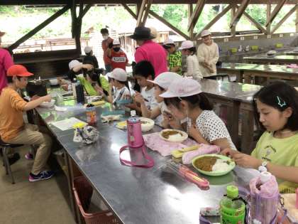 自分たちで協力して火起こしした火で、美味しいカレーを作ることができました。「おいしい。」と笑顔で食べています。