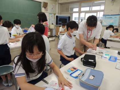 5年生は家庭科の授業で、玉どめ・玉結びを学習しました。