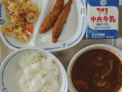 今日の給食は、ご飯、キムチ入りみそ汁、ちくわと野菜のねりごまあえ、ししゃもフライ、牛乳でした。