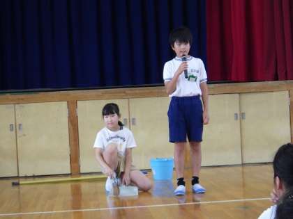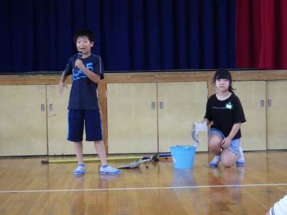 まずは、環境委員会です。掃除の正しい仕方をクイズに出して、実演してくれました。