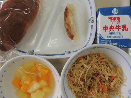 今日の給食は、米粉パン、炒めビーフン、レモンポンチ、ぎょうざ、牛乳でした。
