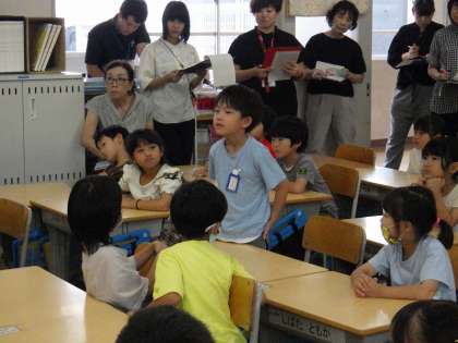 たくさんの先生方に囲まれて、どきどきの子どもたち。でも、広川台小学校の先生に「教えてタイム」でインタビューしたことや「くっつき虫」でよく見てきたことを、堂々と発表することができました。