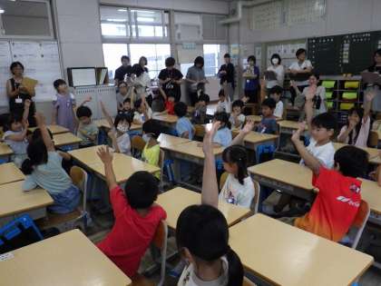 今日の5時間目、1年2組で生活科「ひろかわだいしょうがっこう わくわくたんけんたい」の研究授業がありました。