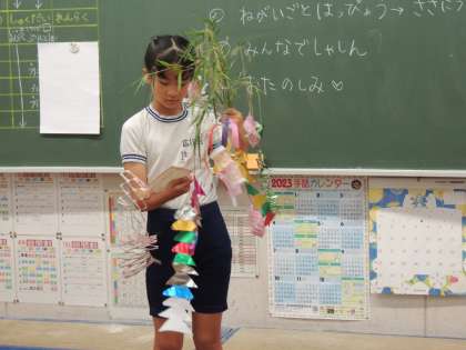 三好特別支援学校の友達と交流(5・6・7・8・9組) 公開日 2023/07/07 更新日 2023/07/07 お知らせ 三好特別支援学校の友達との交流会がありました。 3時間目には、一緒に七夕パーティーをしました。 七夕の願いごとを一人一人が紹介すると「かなうといいね〜」と声を掛けていました。素敵な七夕飾りもありました。
