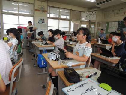 A社とB社の新聞記事を読み比べ、それぞれが伝えたいことを学習用タブレットの発表ノートに書くことをめあてとして、1時間学習しました。