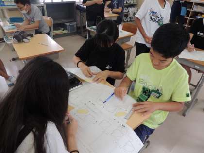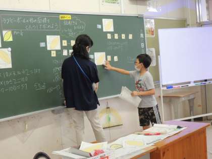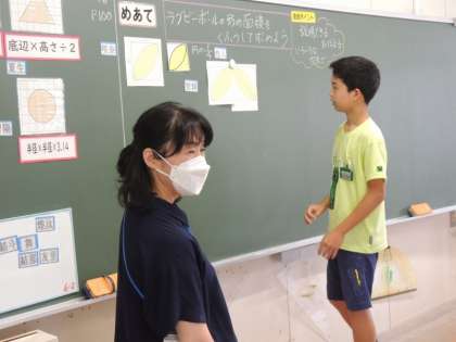 前時に円の面積の公式を学習し、さっそくその公式を使って、ラグビーボール型の面積を求めました。自分の考えをもった後、輪い話いタイム(3人組)で自分の考えを伝え合いました。全体の場で、4つのグループの考えをそれぞれ発表したのですが、4グループとも違う考え方が出てきて、その意見の多様さに驚きました。子どもたちは友達の意見を聞いて、自分一人では気付かないいろいろな考え方に感心していました。