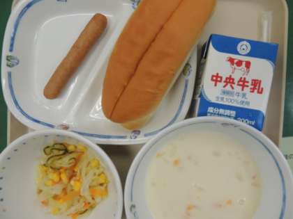 今日の給食は、サンドイッチロール、ポタージュスープ、ウインナー、フレンチサラダ、牛乳でした。