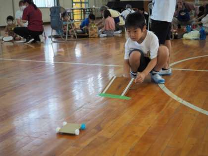 ものづくりサポートプログラム(3年)その2 公開日 2023/09/26 更新日 2023/09/26 お知らせ 先週に引き続き、ものづくりサポートのみなさんによる出前授業がありました。 今日は自分で持ってきた材料でオリジナルの帆を作り、車を走らせました。今日は、スピードを競うのではなく、走る距離を競いました。遠くまで車を走らせるためには重さも重要なことに気付くと、車を軽くするなど様々な工夫をする姿が見られました。