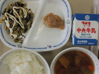 今日の給食は、ご飯、芋煮汁、骨太サラダ、鶏肉のてりやき、牛乳でした。