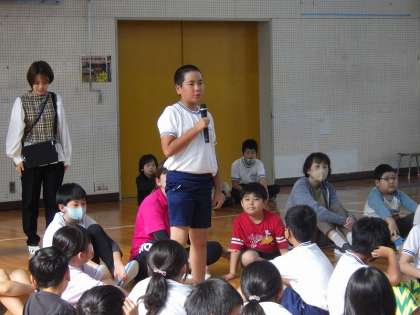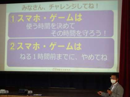 田森先生から大切な3つのこと、1:「10時間眠ろう」2:「休みの日も同じ時刻に起きよう」3:「ゲーム・動画・ラインのルールを作ろう—寝る1時間前にはやめよう」を教えてもらいました。なぜ、睡眠が大切なのかを分かりやすく教えてくださったので、子どもたちはよく理解できたことと思います。