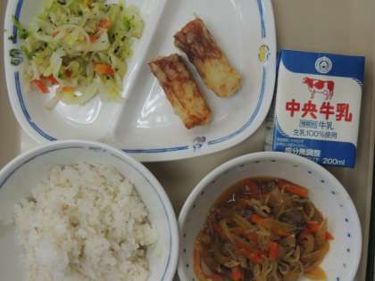 今日の給食は、麦ごはん、豚丼の具、青菜和え、ちくわのてんぷら、牛乳でした。