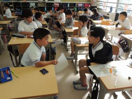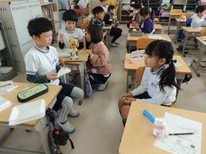 2年生は国語の授業で、1年生をおもちゃまつりに招待するために準備をしています。