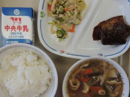 今日の給食は、ご飯、のっぺいじる、さばの味噌煮、和風サラダ、牛乳でした。