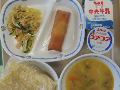 今日の給食は、中華麺、とんこつラーメン、中華和え、春巻き、牛乳、ヨーグルトでした。