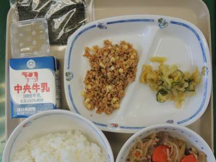 今日の給食は、ご飯、肉じゃが、納豆あえ、胡麻酢あえ、手巻きのり、なしゼリー、牛乳でした。