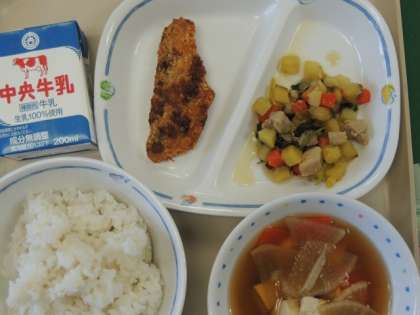 今日の給食は、麦ごはん、けんちんじる、もみじごはんの具、カレイフライ、牛乳でした。