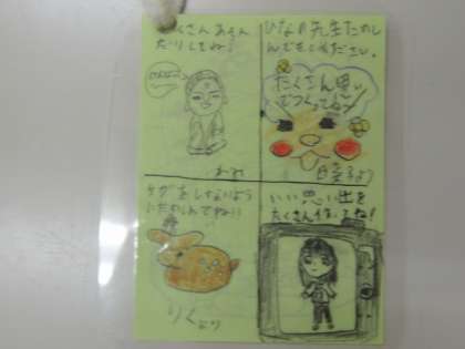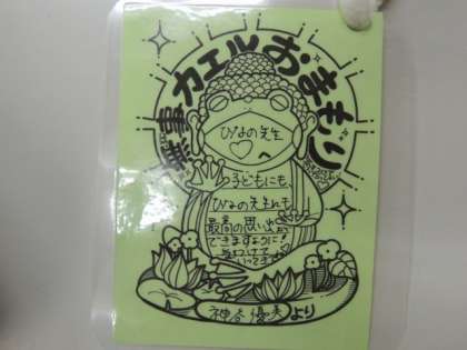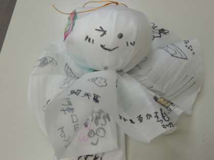 5・6・7・8・9組の子たちからは、巨大なてるてる坊主を。5年生からは一人一人にメッセージの書かれたお守りをプレゼントされました。