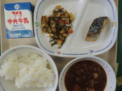 今日の給食は、ご飯、キムチ入り味噌汁、さばの塩焼き、糸切昆布の炒め煮、牛乳でした。