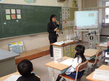 算数の研究授業(2年2組) 公開日 2023/12/01 更新日 2023/12/01 お知らせ 2年2組で算数の研究授業がありました。 九九の学習もいよいよ終盤になり、子どもたちは9の段の学習をしました。 9の段を使って、文章題を解きました。9のいくつ分になるのか、よく考えて問題を解いていました。最後の振り返りでは「9の段は難しい。家でもいっぱい練習して覚えたい」という意見が出ました。