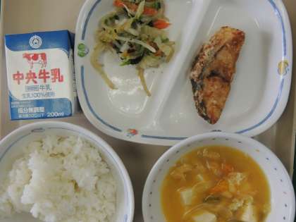 今日の給食は、冬至献立でした。ご飯、かぼちゃの味噌汁、白菜の胡麻和え、ぶりのゆず風味揚げ、牛乳でした。