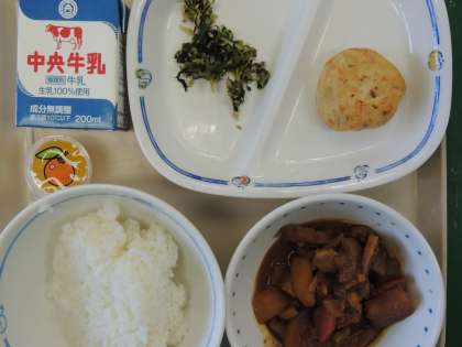 1月9日(火)の給食は、七草献立でした。ご飯、根菜の味噌煮、豆腐しんじょ、七草ご飯の具、プチゼリー(みかん)、牛乳でした。