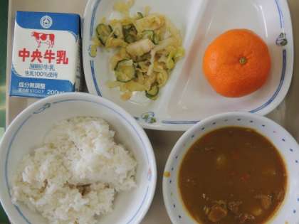 今日の給食は、麦ごはん、カレー、いかサラダ、みかん、牛乳でした。