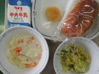 1月24日(水)の給食は、米粉パン、マカロニのクリーム煮、フレンチサラダ、たらナゲット、牛乳でした。