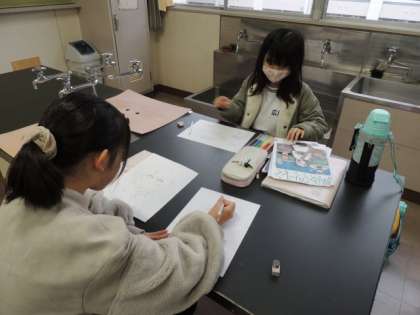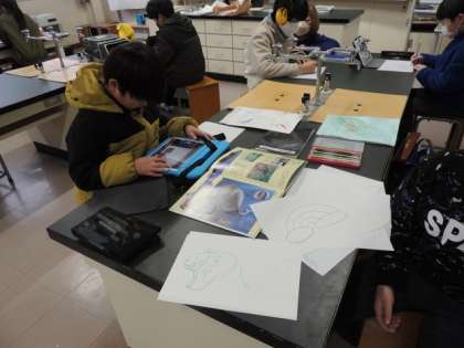 イラストクラブの子は、タブレットや実物、絵を見ながら真剣にイラストを描いていました。作品は図書室の前の廊下に掲示してあります。学校公開日の際に、ぜひ見てくださいね。