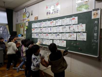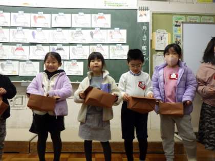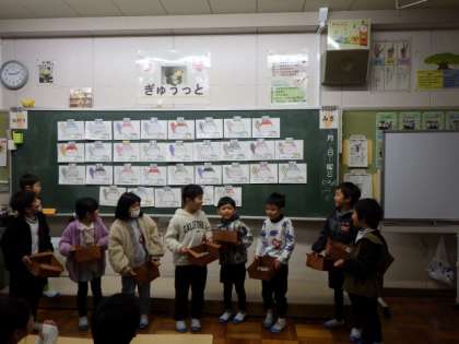 2月3日は節分。1年生は、心の中の鬼を一人一人紙に書いて発表し、新聞紙を豆に見立ててその紙にぶつけました。ぶつける姿は真剣そのもの。