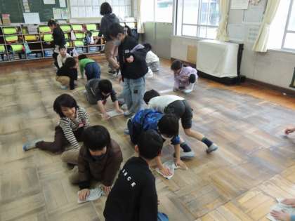 床をきれいに掃き、メラミンスポンジで徹底的に汚れを落とし、最後はみんなで雑巾がけ。6年教室は、少人数でモップをうまく活用して床をきれいにしていました。
