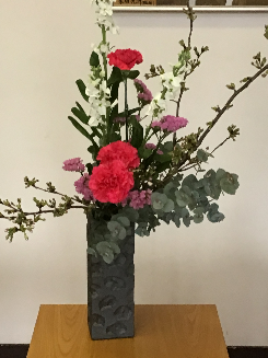小学校の職員玄関に、美しいお花を活けていただきました。