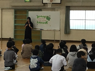 1時間目、体育館では4年生のみんなが集まって1年間の学年で大切にしていきたいことを小野先生から聞いていました。