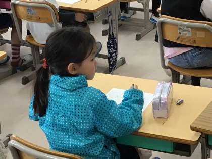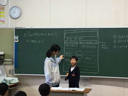 2年1組、2組では「自己紹介カード」をみんなで書いていました。
