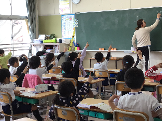 2組の教室では「音楽」の授業で、様々な国のあいさつをしながら歌っていました。