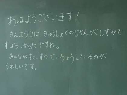 2年2組の黒板には「きんよう日はきゅうしょくのじかんがしずかですばらしかったですね」と琴香先生からお褒めのメッセージが書かれていました。