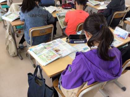 プリントに書かれた空欄部分を教科書や資料集を使って調べていました。